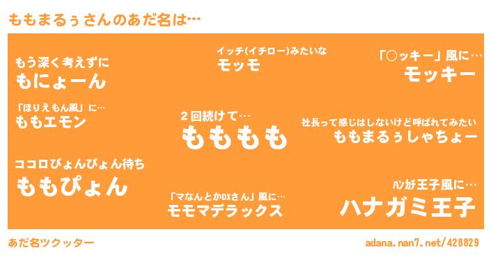 | 欧米人風あだ名 | 『ウサインももまるぅ』『ダニエルももまるぅ』『アンジェラ・ももまるぅ』 |