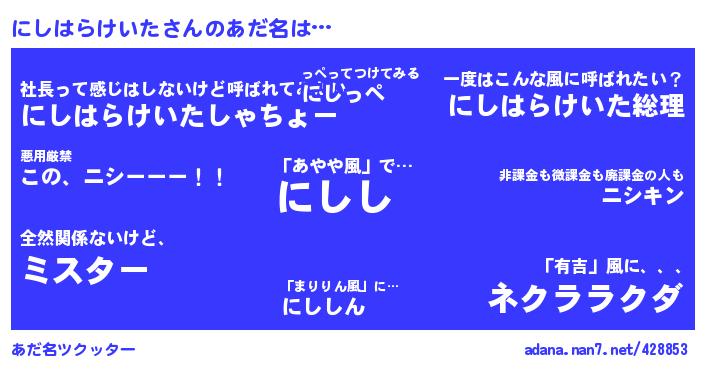 | 女子向けラノベタイトル風あだ名 | 『にしはらけいた様がみてる』『横柄にしはらけいたと宰相陛下』 |