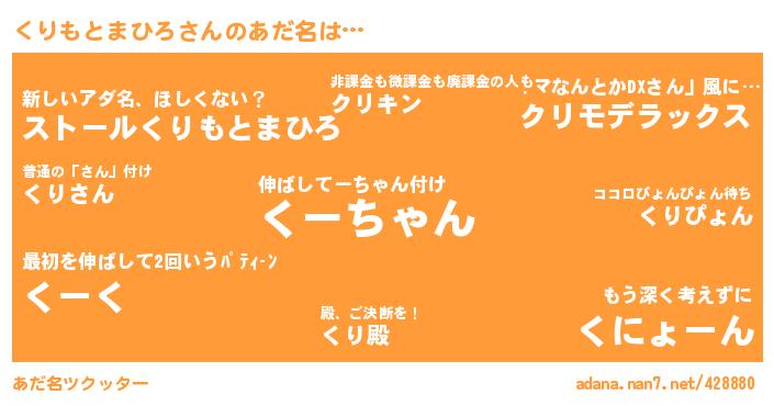 | 意味不明あだ名 | 『永久保存くりもとまひろ』『自称くりもとまひろ』 |