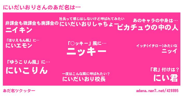 | 男性向けラノベタイトル風あだ名 | 『にいだいおり~年齢イコール彼女いない歴の魔法使い~』 |