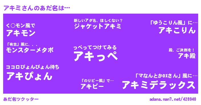 | ヒーロー風カッコイイあだ名 | 『天空の使者アキミ』『ウルトラ戦士アキミ』『仮面アキダー』 |