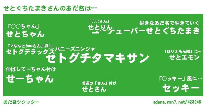 | ヘコむあだ名 | 『せとふぇ~』『豆乳』『せとぷりん』『せとぐちたまき(小並感)』 |