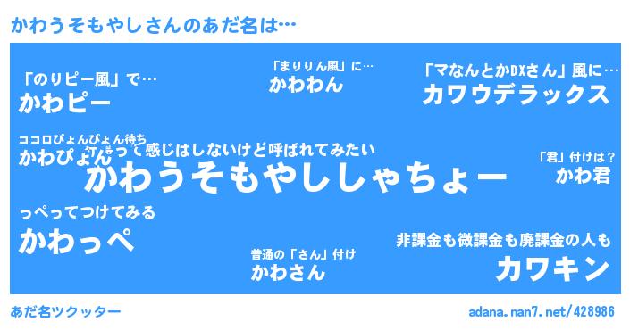 | ヘコむあだ名 | 『かわふぇ~』『豆乳』『かわぷりん』『かわうそもやし(小並感)』 |