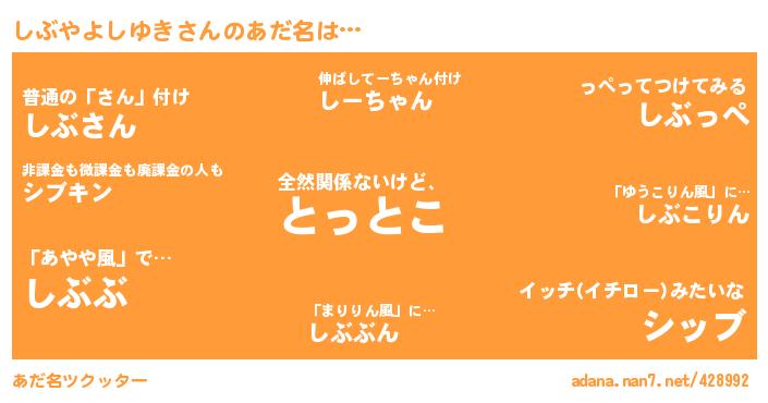 | 意味不明あだ名 | 『とにかく怪しいしぶやよしゆき』『自称しぶやよしゆき』 |