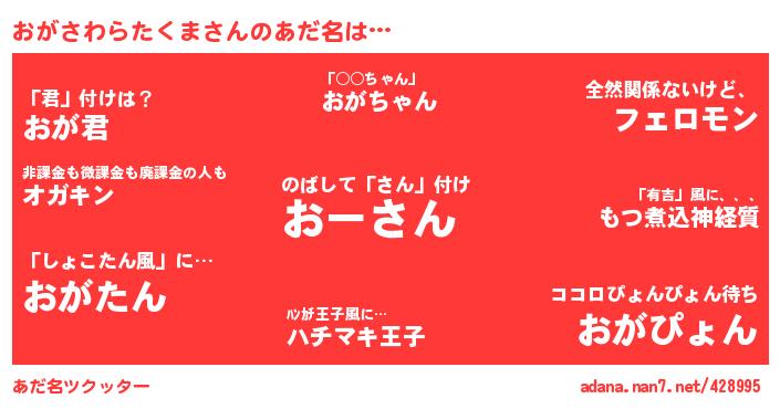 | ヘコむあだ名 | 『おがふぇ~』『豆乳』『おがぷりん』『おがさわらたくま(小並感)』 |
