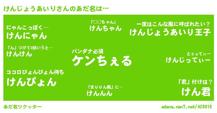 | 可愛いあだ名 | 『けーみん』『けんじょうあいりママ』『けんけん』『ぽよけん』 |