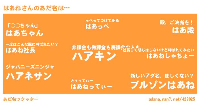 | ヘコむあだ名 | 『はあふぇ~』『豆乳』『はあぷりん』『はあね(小並感)』 |