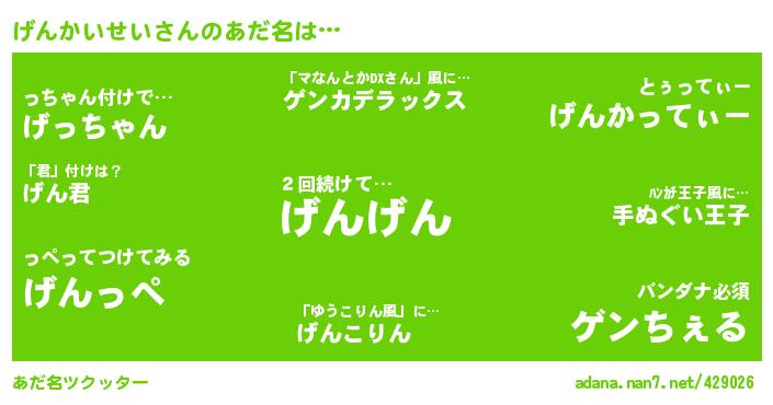 | 男性向けラノベタイトル風あだ名 | 『げんかいせいの嫁は女の子じゃないと思った?』『げんかいせいの憂鬱』 |