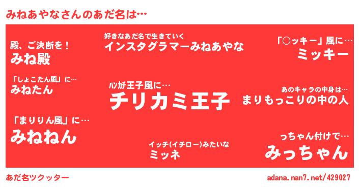 | 女子向けラノベタイトル風あだ名 | 『異世界でカフェみねあやなを開店しました。』『みねあやな姫と円卓の騎士』 |