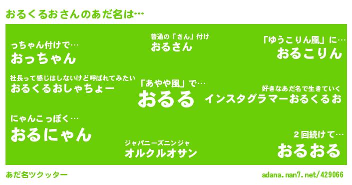 | 意味不明あだ名 | 『永久保存おるくるお』『ペロリンおるくるお』『おるくるおフォーエバー』 |