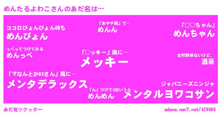 | 女子向けラノベタイトル風あだ名 | 『めんたるよわこ様がみてる』『シンデレラめんたるよわこ家の靴箱館』 |