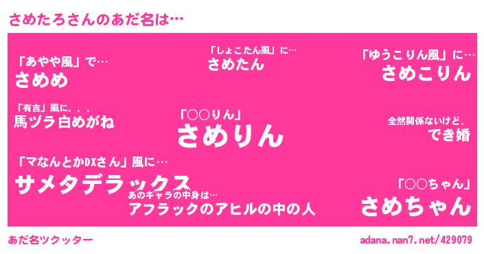 | 意味不明あだ名 | 『永久保存さめたろ』『住所不定無職さめたろ(79歳)』『ペロリンさめたろ』 |