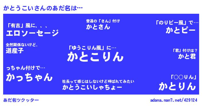 | 男性向けラノベタイトル風あだ名 | 『かとうこい~年齢イコール彼女いない歴の魔法使い~』 |
