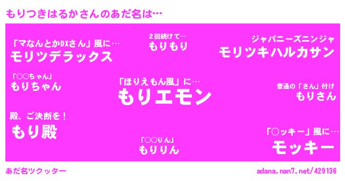 | ヘコむあだ名 | 『もりふぇ~』『豆乳』『もりぷりん』『もりつきはるか(小並感)』 |