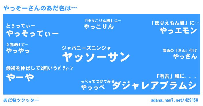 | 男性向けラノベタイトル風あだ名 | 『この素晴らしい世界にやっそーを!』『魔法科高校のやっそー』 |