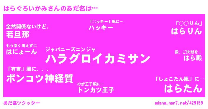 | ポケモン風あだ名 | 『ヒハラグロイカミ』『メロハッラ』『ハラキング』『ハラゴンZ』 |