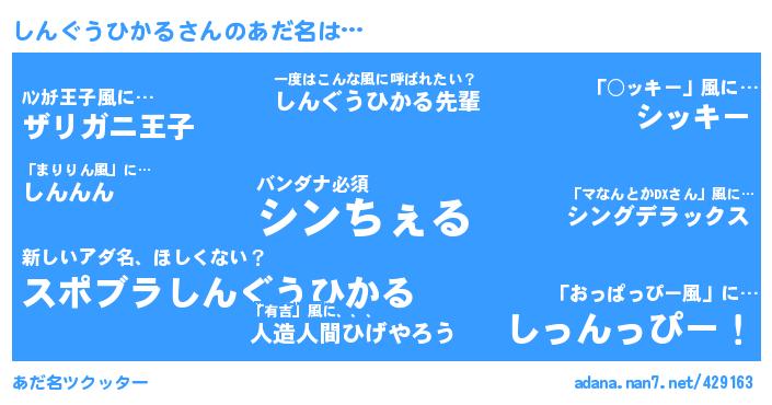 | ポケモン風あだ名 | 『ヒシングウヒカル』『ゼニシン』『シンゴンZ』『シンキング』 |