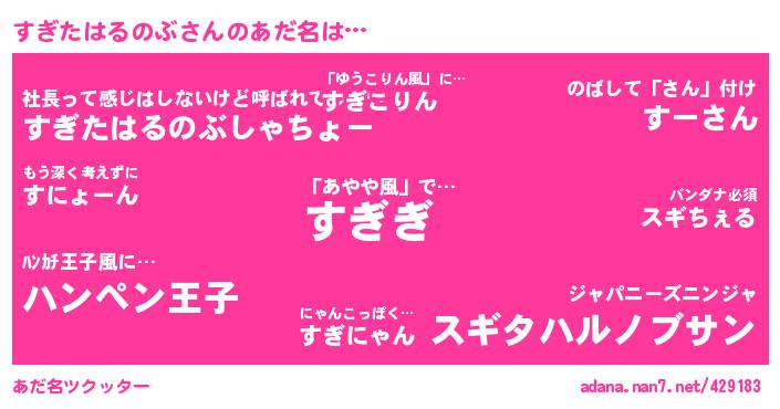 | 意味不明あだ名 | 『ニラ科すぎたはるのぶ属』『住所不定無職すぎたはるのぶ(79歳)』 |