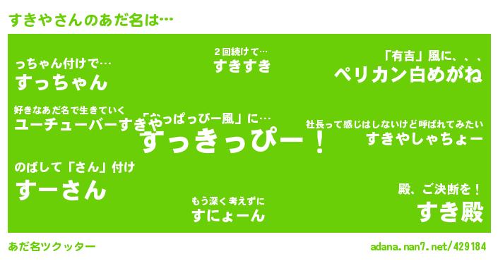 | ヘコむあだ名 | 『すきふぇ~』『豆乳』『すきぷりん』『すきや(小並感)』 |