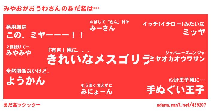 | ポケモン風あだ名 | 『メロミッヤ』『ミヤゴンZ』『ヒミヤオカオウワ』『ミヤセウス』 |
