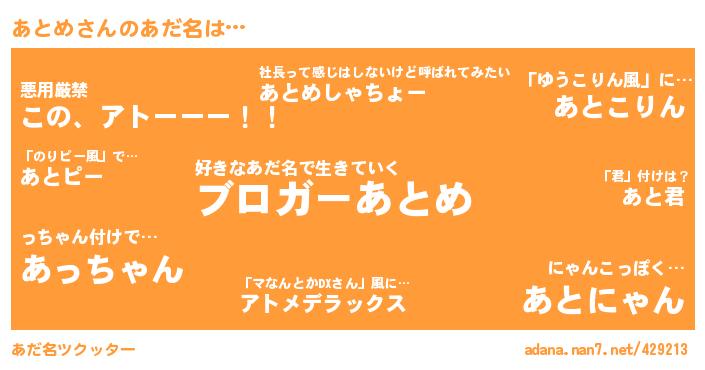 | 女子向けラノベタイトル風あだ名 | 『死神あとめの再婚』『あとめの卵を拾いまして』『あとめ伯爵の花嫁』 |