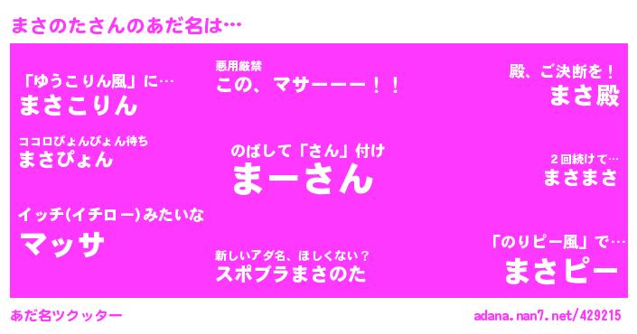 | ヘコむあだ名 | 『まさふぇ~』『豆乳』『まさぷりん』『まさのた(小並感)』 |