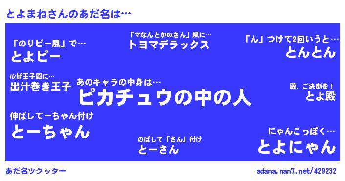 | ポケモン風あだ名 | 『トヨマダネ』『トックウザ』『メロトッヨ』『トーヨイ』 |