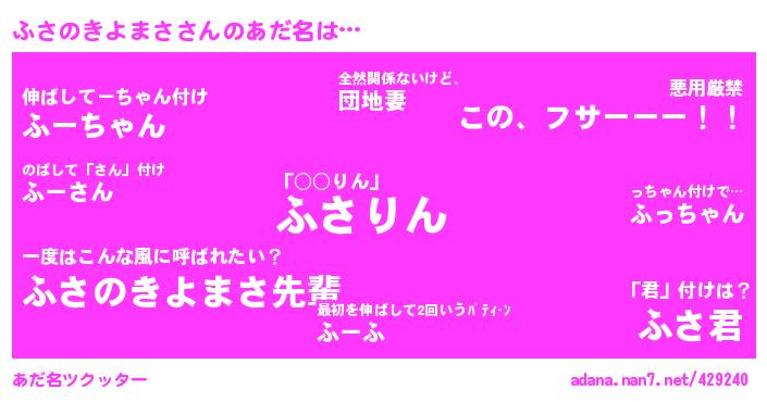 | ヘコむあだ名 | 『ふさふぇ~』『豆乳』『ふさぷりん』『ふさのきよまさ(小並感)』 |