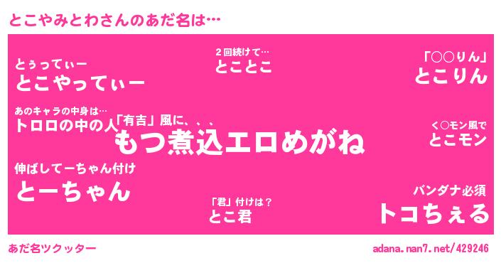 | ヘコむあだ名 | 『とこふぇ~』『豆乳』『とこぷりん』『とこやみとわ(小並感)』 |