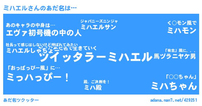 | ヘコむあだ名 | 『ミハふぇ~』『豆乳』『ミハぷりん』『ミハエル(小並感)』 |