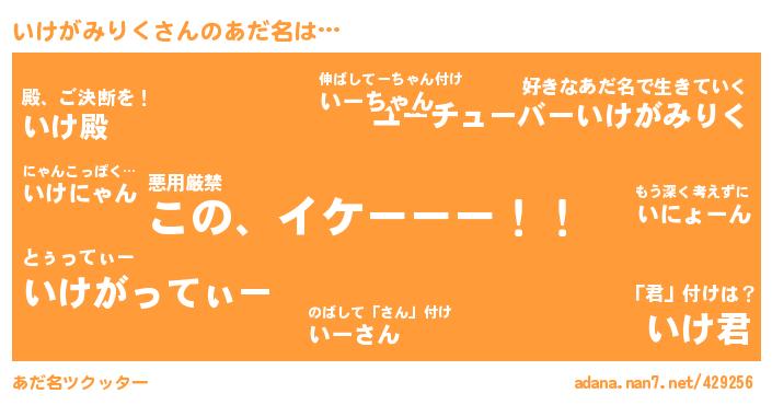 | 意味不明あだ名 | 『いけがみりくフォーエバー』『永久保存いけがみりく』 |