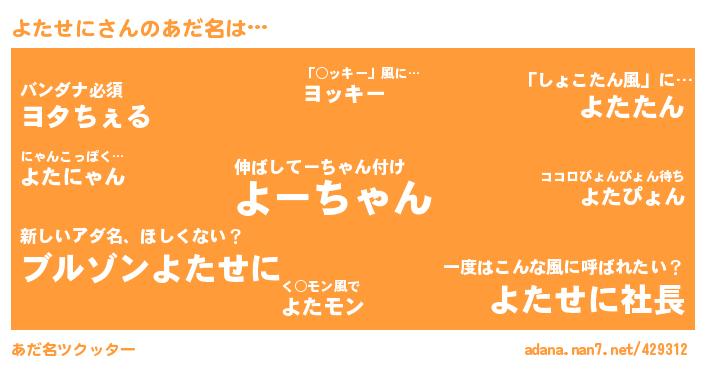 | 意味不明あだ名 | 『とにかく怪しいよたせに』『よたせにフォーエバー』『自称よたせに』 |