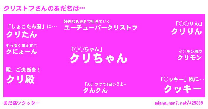 | ヘコむあだ名 | 『クリふぇ~』『豆乳』『クリぷりん』『クリストフ(小並感)』 |