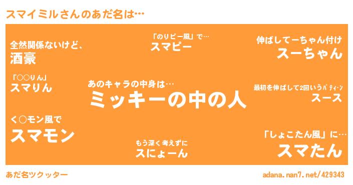 | ヒーロー風カッコイイあだ名 | 『天空の使者スマイミル』『仮面スマダー』『スーパースマイミル』 |