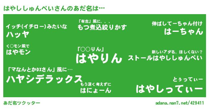 | 男性向けラノベタイトル風あだ名 | 『ノーゲーム・ノーハヤシシュンペイ』『冴えないはやししゅんぺいの育てかた』 |