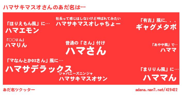 | 意味不明あだ名 | 『住所不定無職ハマサキマスオ(40歳)』『ペロリンハマサキマスオ』 |
