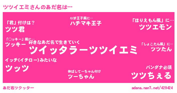 | 男性向けラノベタイトル風あだ名 | 『ツツイエミ~年齢イコール彼女いない歴の魔法使い~』 |