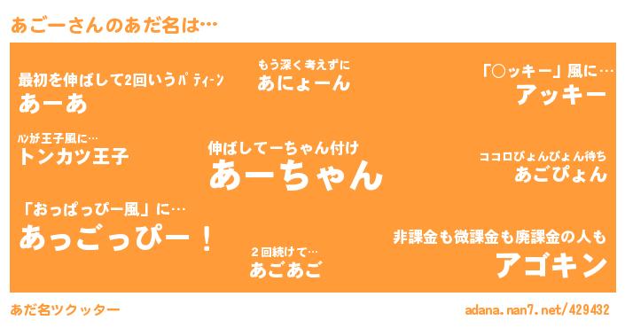 | 女子向けラノベタイトル風あだ名 | 『あごーの婚約者』『首の姫と首なしあごー』『あごーの卵を拾いまして』 |