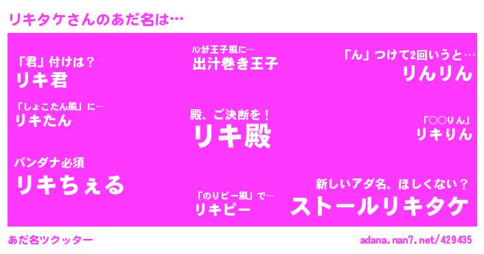 | 男性向けラノベタイトル風あだ名 | 『うちのリキタケが世界を掌握している!』『転生したらリキタケだった件』 |