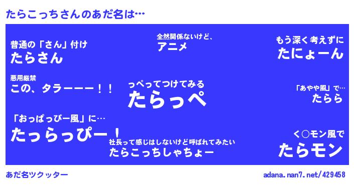 | 女子向けラノベタイトル風あだ名 | 『たらこっちの玉の輿計画!』『首の姫と首なしたらこっち』 |