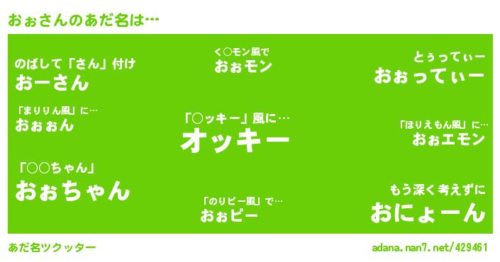| 男性向けラノベタイトル風あだ名 | 『オォアートオンライン』『魔法科高校のおぉ』『冴えないおぉの育てかた』 |