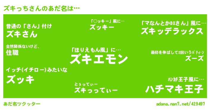 | ポケモン風あだ名 | 『ズキチュウ』『ズキセウス』『ヒズキッチ』『ゼニズキ』 |