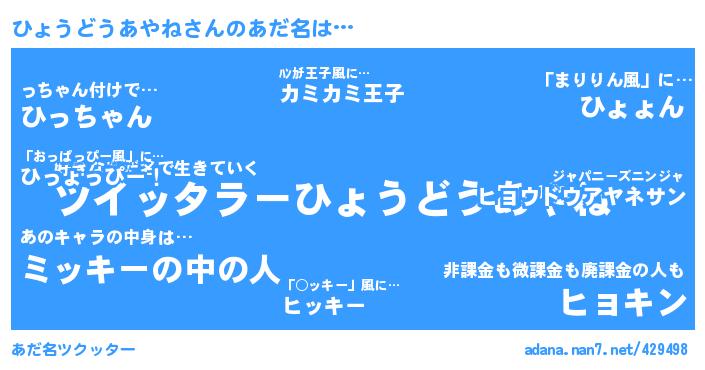 | ヘコむあだ名 | 『ひょふぇ~』『豆乳』『ひょぷりん』『ひょうどうあやね(小並感)』 |