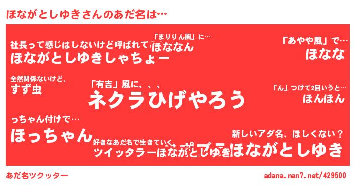 | ヘコむあだ名 | 『ほなふぇ~』『豆乳』『ほなぷりん』『ほながとしゆき(小並感)』 |
