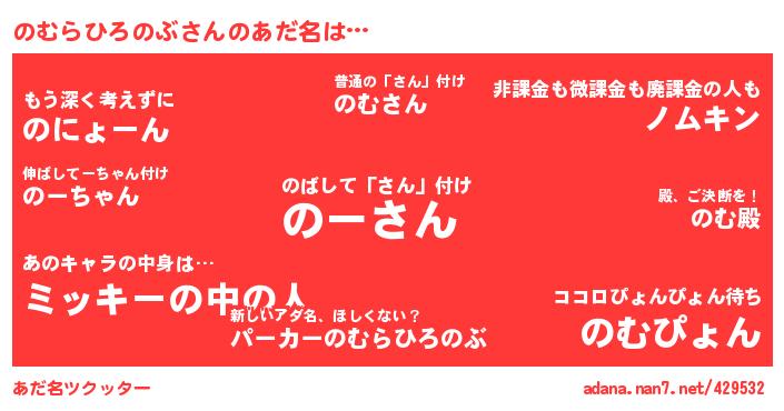 | 男性向けラノベタイトル風あだ名 | 『うちののむらひろのぶが世界を掌握している!』『ノムラヒロノブスレイヤー』 |