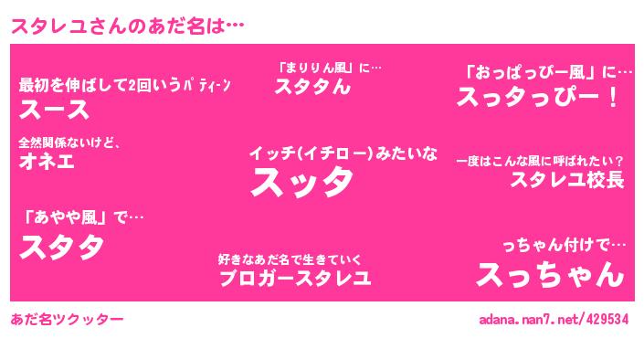 | ヘコむあだ名 | 『スタふぇ~』『豆乳』『スタぷりん』『スタレユ(小並感)』 |