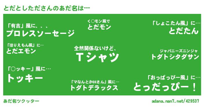 | ポケモン風あだ名 | 『トダチュウ』『メロトッダ』『トダゴンZ』『ヒトダトシタダ』 |