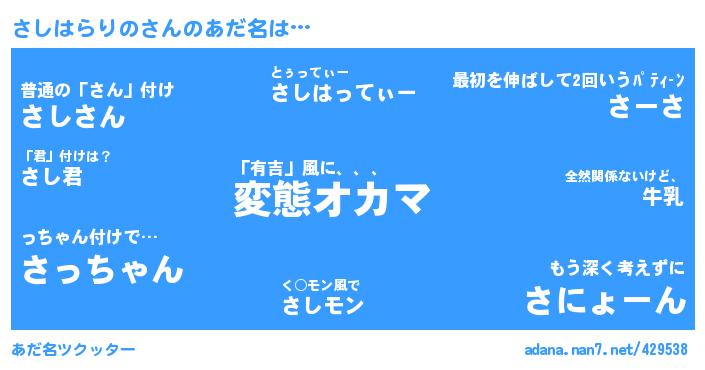 | 意味不明あだ名 | 『眠気覚ましガムさしはらりの味』『自称さしはらりの』 |