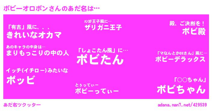 | ヘコむあだ名 | 『ボビふぇ~』『豆乳』『ボビぷりん』『ボビーオロボン(小並感)』 |