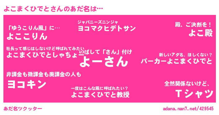 | 男性向けラノベタイトル風あだ名 | 『ヨコマクヒデトアートオンライン』『ノーゲーム・ノーヨコマクヒデト』 |